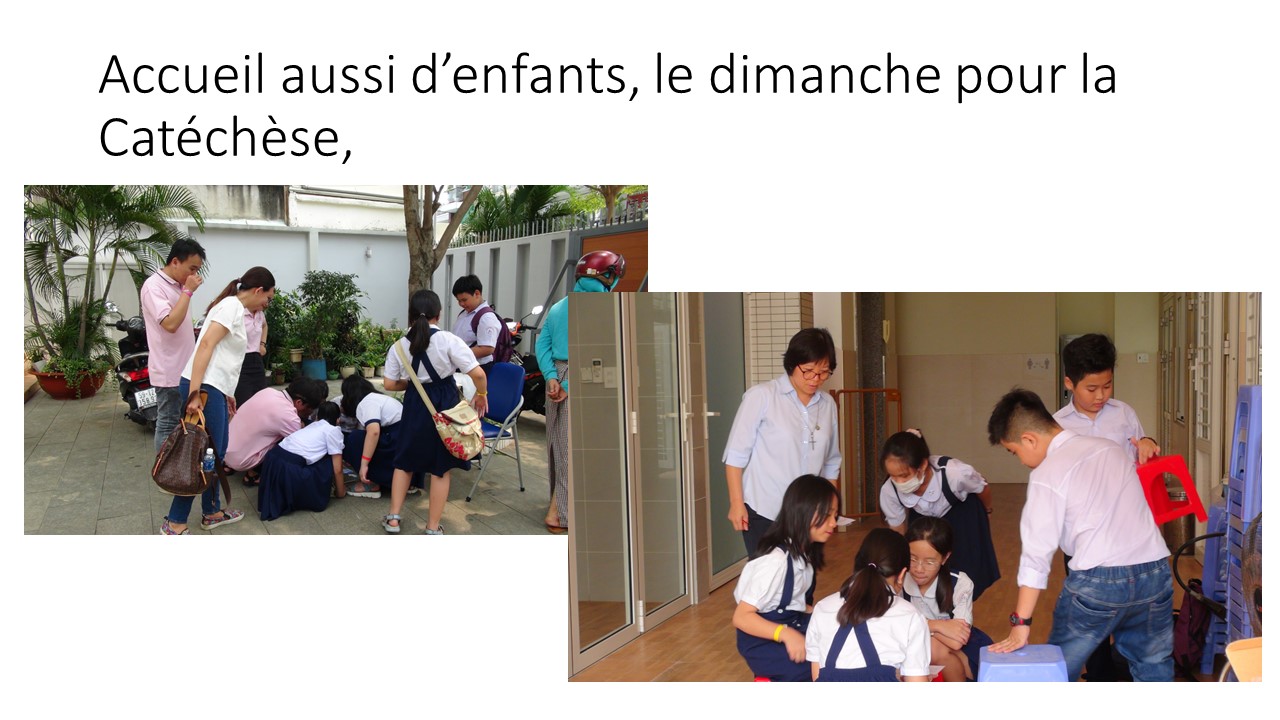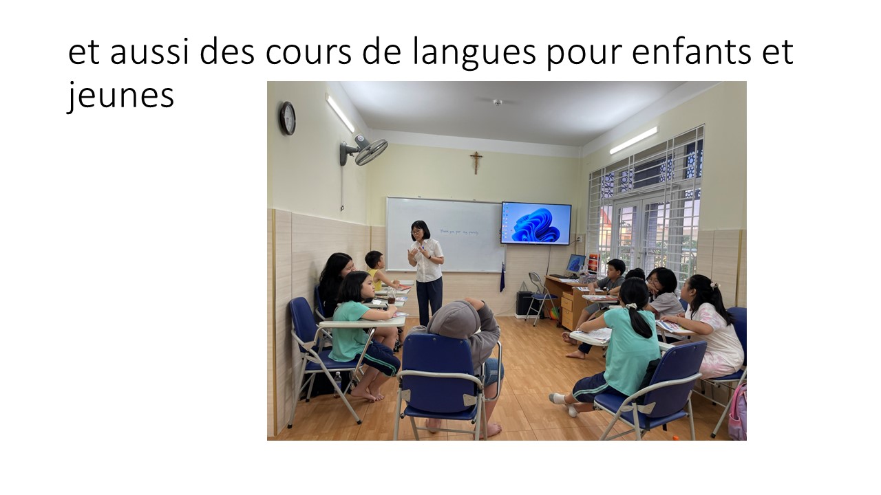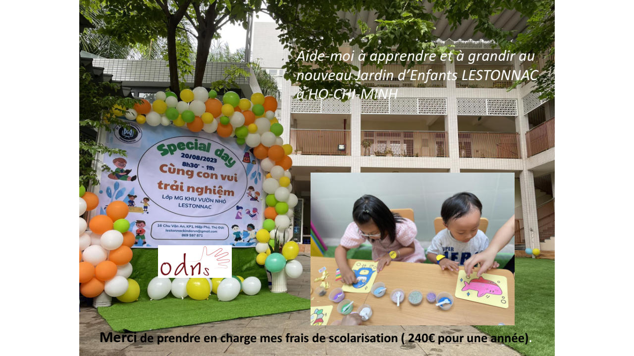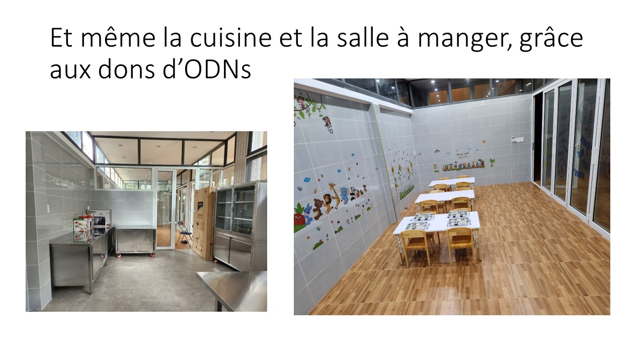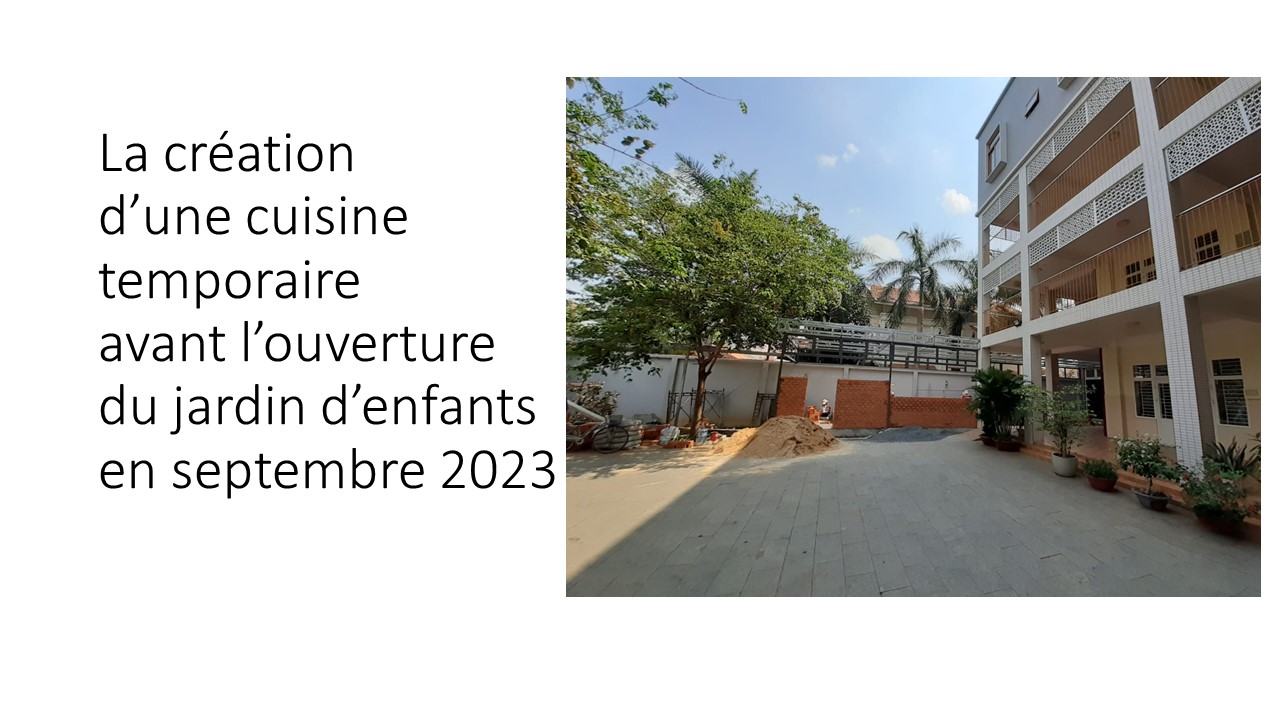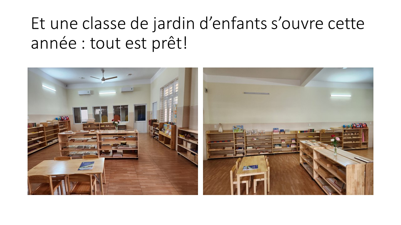 Le petit jardin d’enfants « Lestonnac » a débuté avec 11 enfants (4 garçons et 7 filles). La classe est bien aménagée avec du matériel Montessori (chinois, c’est moins cher), la cour est accueillante avec des jeux d’enfants, ….MERCI à Madame Ha, la directrice officielle, Nga et Yen pour leur investissement efficace !